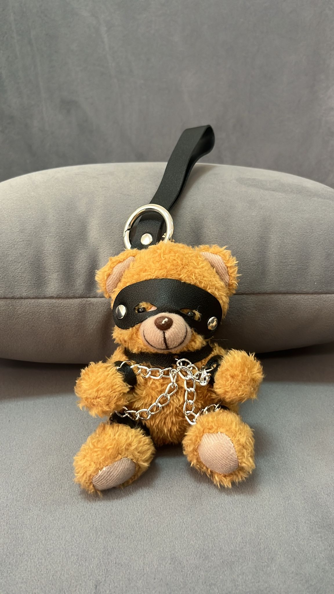 Breloc ursuleț din pluș cu mască și lanț metalic
